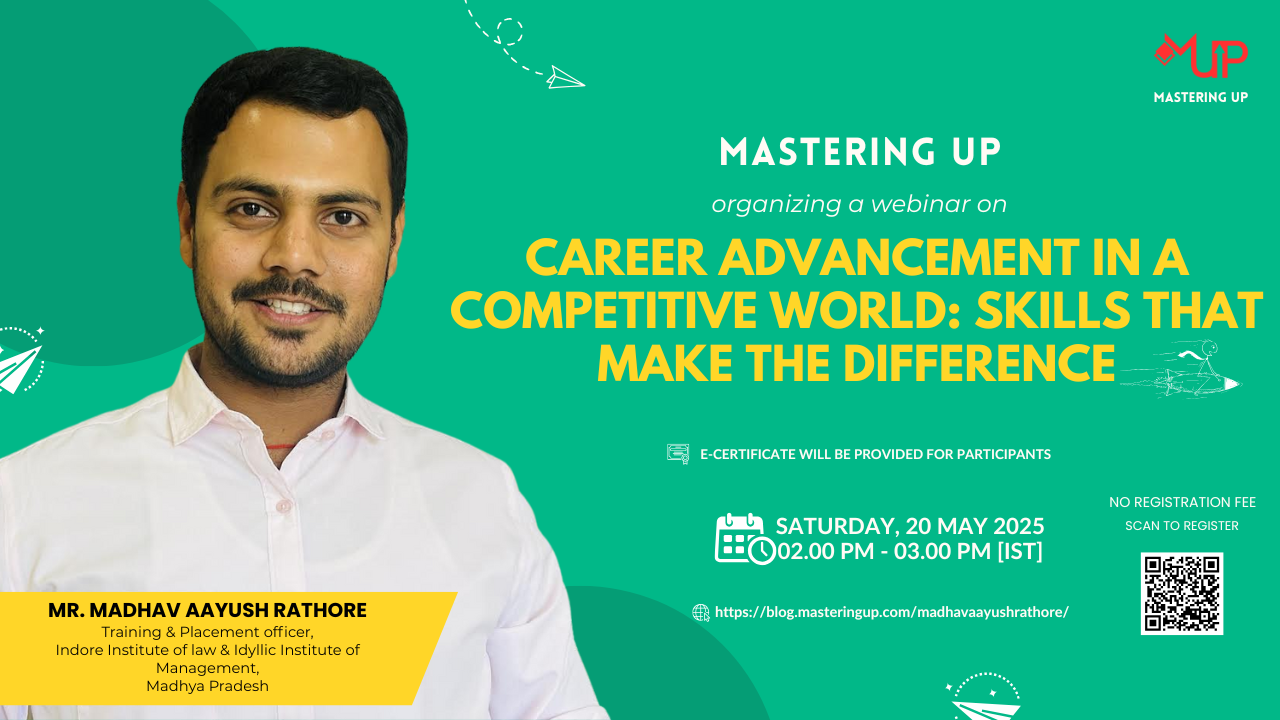 Mastering Up organizing a free online skill development session titled “Career Advancement in a Competitive World: Skills That Make the Difference” delivered by ” Mr. Madhav Aayush Rathore [Training & Placement officer, Indore Institute of law & Idyllic Institute of Management, Madhya Pradesh]”