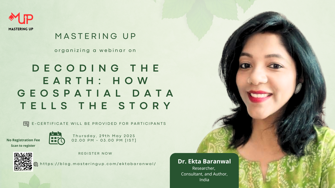 Mastering Up organizing a free online skill development session titled “Decoding the Earth: How Geospatial Data Tells the Story” delivered by “Dr. Ekta Baranwal [Researcher, Consultant, and Author, India]”