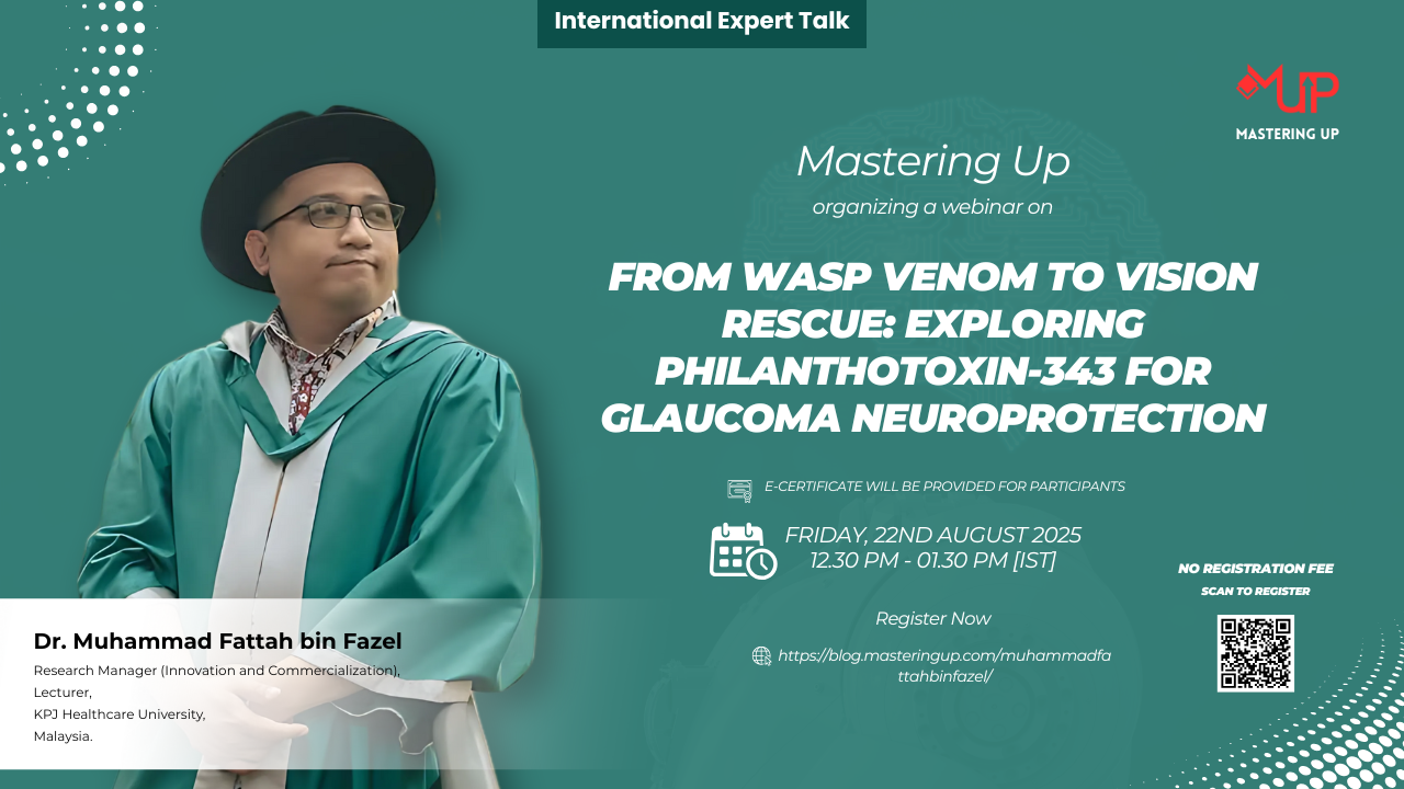 Mastering Up organizing a free online skill development session titled “From Wasp Venom to Vision Rescue: Exploring Philanthotoxin-343 for Glaucoma Neuroprotection” delivered by “Dr. Muhammad Fattah bin Fazel [Research Manager (Innovation and Commercialization), Lecturer, KPJ Healthcare University, Malaysia]”