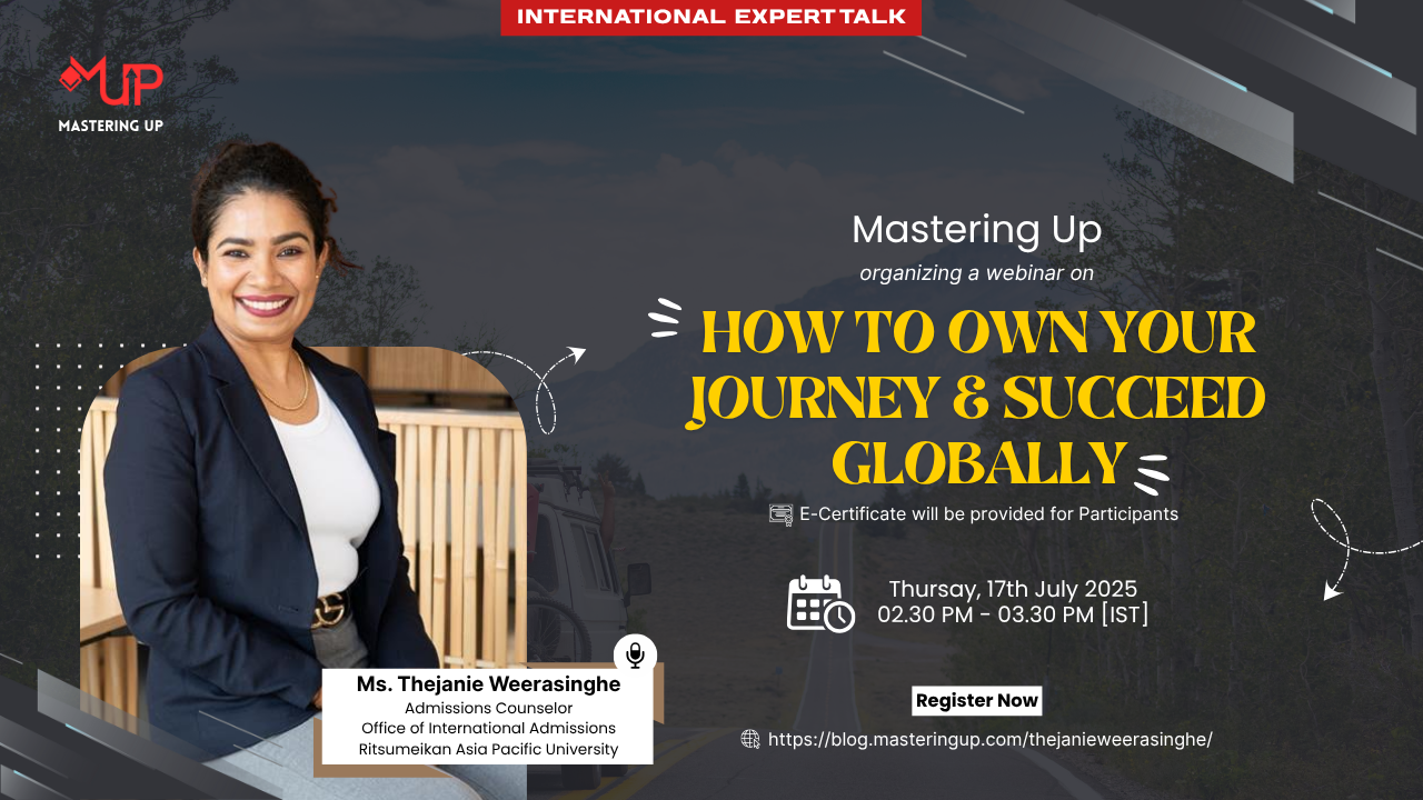 Mastering Up – Blog https://blog.masteringup.com/ Participate and Learn for Free Thu, 21 Aug 2025 06:53:47 +0000 en-US hourly 1 https://wordpress.org/?v=6.8.2 https://blog.masteringup.com/wp-content/uploads/2023/05/cropped-Mastering-Up-Logo-Black-Text-32x32.png Mastering Up – Blog https://blog.masteringup.com/ 32 32 How to Own Your Journey & Succeed Globally – Ms. Thejanie Weerasinghe https://blog.masteringup.com/thejanieweerasinghe/ https://blog.masteringup.com/thejanieweerasinghe/#respond Wed, 09 Jul 2025 08:06:07 +0000 https://blog.masteringup.com/?p=849 About the Event: Mastering Up organizing a free online skill development session titled “How to Own Your Journey & Succeed Globally “ delivered by “Ms. Thejanie Weerasinghe [Admissions Counselor,Office of International Admissions,Ritsumeikan Asia Pacific University]“ Date: 17/07/2025 (Thursday) Time: 02.30 PM -03.30 PM (IST) E-Certificated will be provided. About the Guests: Ms. Thejanie Weerasinghe serves as […]